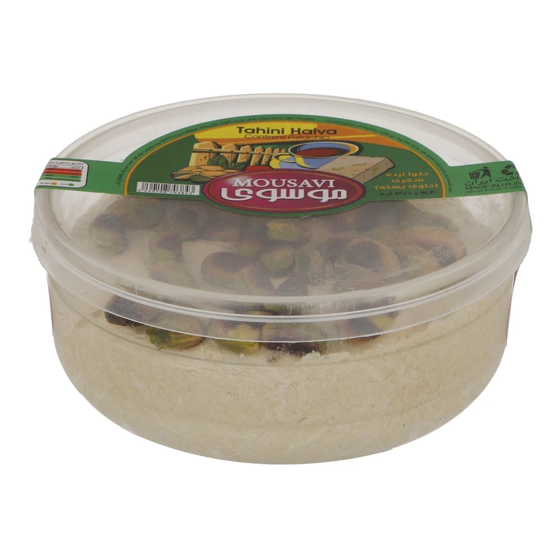 حلوا ارده شکری حاوی پسته شیشه 300 گرمی موسوی